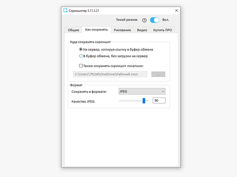 По умолчанию все созданные скриншоты и видео автоматически сохраняются в облаке. Ссылка на файл сразу копируется в буфер обвала, и вы можете мгновенно отправить её в любом мессенджере или по электронной почте. Чтобы вставить ссылку, просто используйте комбинацию клавиш Ctrl+V или выберите опцию «Вставить» в контекстном меню. Также вы можете в настройках выбрать сохранение файлов на компьютер.
